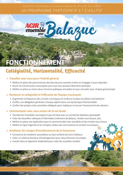 La liste Agir ensemble pour Balazuc invite les habitants à choisir une nouvelle façon de faire vivre leur village. Elle propose une méthode participative, fondée sur la consultation et l’implication des habitants dans les décisions. L’équipe, unie et organisée de manière horizontale, veut associer efficacité, vision à long terme et proximité.